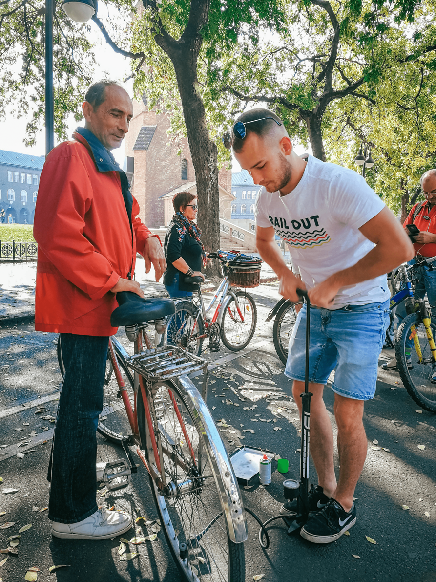 Azoknak akik megálltak, felpumpáltuk a kerekét és megolajoztuk a láncát és szívesen beszélgettünk vele bármilyen városi közlekedési kérdésről. Ha megkérdezték, hogy ezt miért kapták vagy fizetni akartak érte, mi csak annyit mondtunk: Örülünk, hogy bringával közlekedsz! Csak így tovább, szép napot!